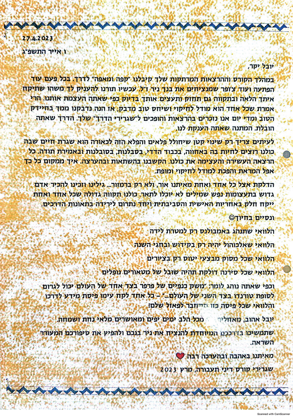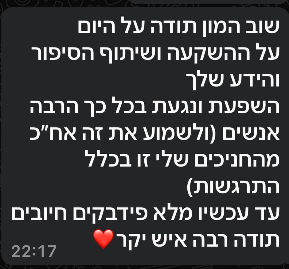 "שוב המון תודה על היום, על ההשקעה, שיתוף הסיפור והידע שלך. השפעת ונגעת בכל כך הרבה אנשים. (ולשמוע את זה אח"ע מהחניכים שלי זו בכלל התרגשות) עד עכשיו מלא פידבקים חיוביים. תודה רבה איש יקר."