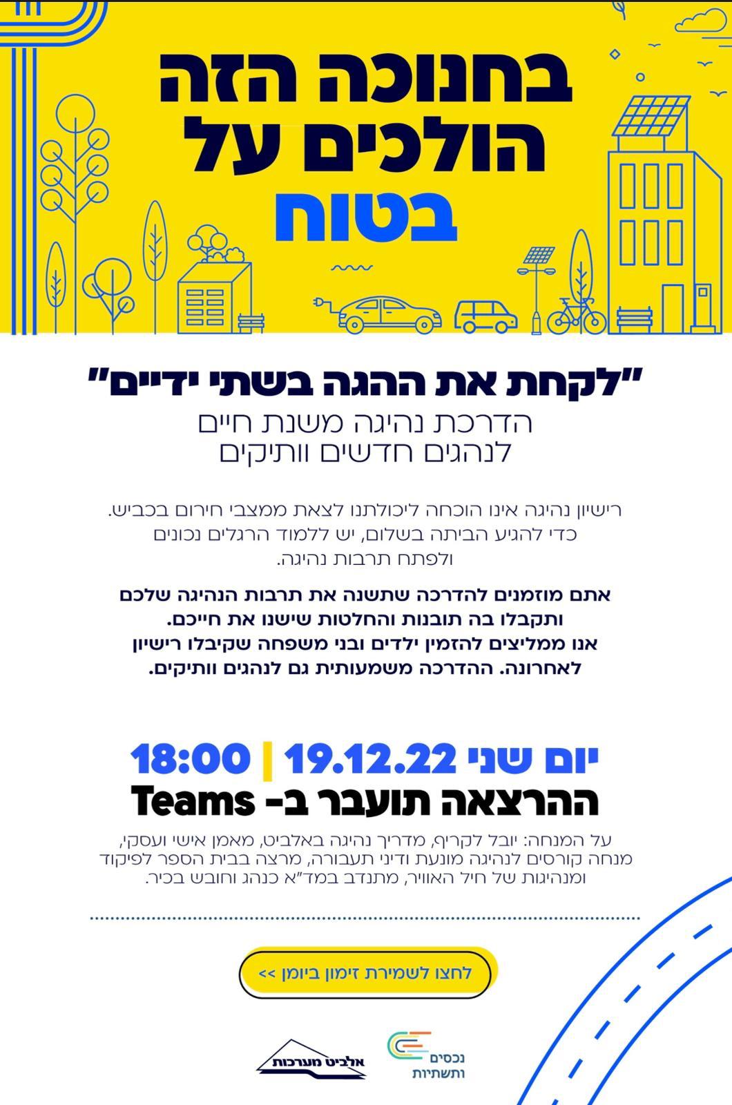 רציתי להגיד לך תודה רבה על הרצאה מרתקת, מעניינת ומצילת חיים אין ספק שאני אקח איתי כמה דברים להמשך... במיוחד את העניין שאנחנו מראה לילדים שלנו ואעשה מאמצים להיות יותר רגועה בכביש. יצא לי לקרוא על הבן שלך שנראה שהיה מלח הארץ. מאחלת לכם שלא תדעו עוד צער והרבה בריאות ובשורות טובות!
